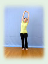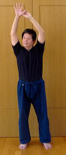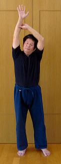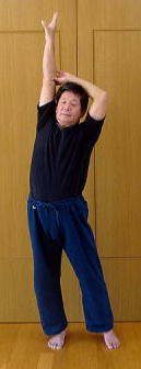 右手挙上。掌をいっぱいに開き、五指分開して伸展。労宮を全開。 左手を右手首に添え、掌をさらに上に引き抜く。 左手を前腕に添え、上に引き抜く。次いで、肘に添え、上腕に添えて腕を上に引き抜く。 体重を右足に載せ、右掌を外に向け、左手を右上腕に添えたまま、肩を抜き、肩甲骨を抜き、骨盤を抜き、膝を抜き、足首を抜き、爪先立ちとなる。 以上、右式。 左右入れ換えて、今度は左手を挙上。同様にして左手を抜く。 背伸びは健康法第一条である。 そのコツは左右片側ずつ、しっかり伸ばすこと。しかも、対側の手を添えて、引っ張られる感覚で伸展させる。手首、肘、肩、肩甲骨、腰、膝、足首、足の拇指と順番に数珠でつなぎ、引きずり挙げるようにする。 左右1回ずつ。ただし一ふしずつ丁寧に伸ばしていくこと。目標は、バンザイして両腕が耳に触れること。 |