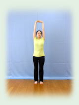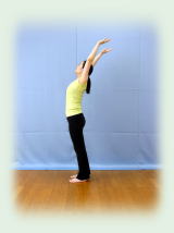 両手を挙げ、腕で耳をはさみ、 腰を締め、 肩の高さを中心に背骨と骨盤を 前後に煽ること20回。 以上を1セットとして、合計3回。 |