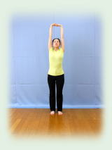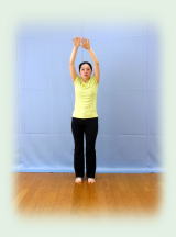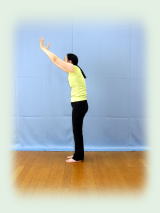 足幅狭く。 腰を締めて両手挙上。 手を組み、掌を上に向け、肘を伸ばして 手首を左右交互に突き上げて 前に回し下ろす。 ペダルを漕ぐように! 20回。 |