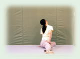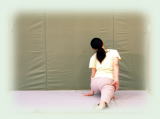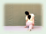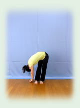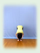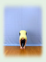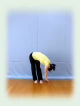 両腕で耳を挟んだ万歳姿勢から 背中平ら、お尻を後ろに突き出して 上体を二つ折りにして 前屈。 膝伸ばしたまま 両手指先を前の床、左右の床を それぞれ3回ずつ指で突く。 正面で足首をつかみ、 臍を膝に着けること3回。 膝腰を弛めて上体を起こしてくる。 |