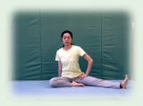 胴体を右に捩じる。臍鳩尾胸肩頸顎の順に捻転。右目尻から後ろを見て自分の踵が見えるように絞る。 左半身にネジを切ったら、右側面図のように、左脚を畳み右半身をネジ締めていく。 |