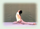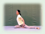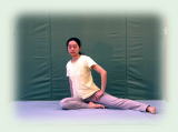 右尻を浮かせ、左膝を内に捩じり込み膝裏を上に向け、足の裏を上に向けて骨盤の後ろに左脚が伸びている形。鼠蹊部が開いて骨盤内の大腰筋が脚のほうに引きずり出されるように伸びる。 |