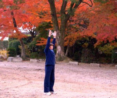 終わるときは、両手を臍の上に重ねる。重ねてそのまま30秒。 息を吐ききり、おなかを締め、そのまま息を吸って吐くと同時に手を下ろして、気功はおしまい。 気功を終えるときの最後の所作を「収功」といいます。 ここまで、せいぜい4~5分ですが(早ければ1~2分)、リラックスが維持できれば、これだけでも「気功トリップ」になります。 問題は、リラックスですね。リラックスが不完全だと、ただの時間のムダです。 いかがですか。気功は一言でいえば「静の行」なのです。静けさの中に居ることなのです。そこに「私」の居場所を作るのです。 |