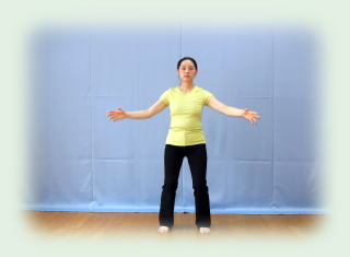 胸を開いて、肩を開いて、手を横から挙げていきます。 手首を吊り上げられる感じで、腋を開いて胸の高さまで。 それから掌を向かい合わせ、大きな風船を抱える気分。 この動きを「開」といいます。 腕だけでなく、からだ全体が膨らんでいくようにイメージします。 外から見れば、たんなる手の動きですが、 おなかが膨らみ、胸が膨らみ、腰が膨らみ…、手も膨らんでしまう、なのです。全身の膨らみを手で表現するというか。 |