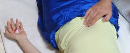 | 14. | 心包点を操作点にして、右手の経に第一治療経(点)があると推認できるので、同様の反応が操作点を変えても起こるかどうか、診てみることにしました。 腹診点ではなく、診断筋を操作点にする場合は、9で診た異常緊張のあった診断筋を改めて触診して、先生はもっとも左右差の甚だしい左内転筋を選びました。 左内転筋をつかむと、痛い! |