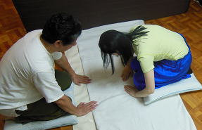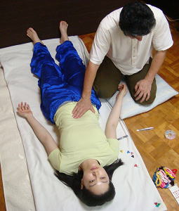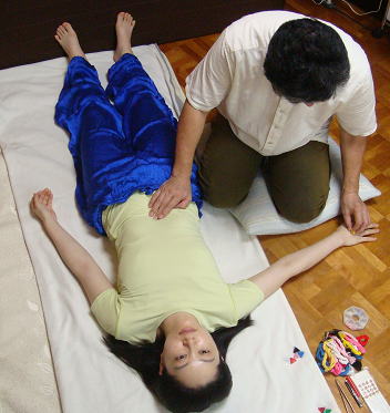 | 2. | 施術室(といっても臨時のお部屋)は、畳のへやで、薄いマットにシーツ。頭を北向きにして横たわる。マットの西側に先生、東側の座布団二つは患者さんと付き添いの人の席。または次の患者さんの席。つまり、公開治療ということで、あやしいこと、へんなことはしませんよと。 マットに北向きで寝るというのは、地磁気による診断の濁りを排除するためなんだそうです。北向きで診断すると、診断反応がはっきり判るからと。で、先生と患者がマットをはさんでお辞儀。よろしく…と。 |