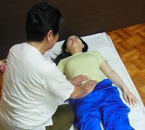 | 7. | 今度は仰向け。そして、上着をめくり下着一枚の状態で腹診。おなかのツボには、内臓のまたは経絡の異状が現れているそうです。 へそを最初に押して、そのあとは次々とツボを押していきます。腹診点です。そこをスッスッスッと押していく。同じことを2回くりかえしてから、あらためて、ここ痛いでしょ、ここも、と確認していく。それが、○経異常?と見当をつけていくことなんです。 |