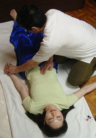 | 8. | それから、最初は 後頭骨から肩、胸、腋、腰、大腿、膝、脛と、両手同時に筋肉を触っていく。これを診断筋操法とか、診断筋の触診といいます。ここまでが前段。 右の写真は、後頸部の肩甲挙筋(胃経の診断筋)の触診。以下触診をつづけて、おおよそ診断の見当をつけて、診断操法を組み立てる。 凝りが強くて、患者も苦痛を自覚するポイントを操法点とします。その痛いところが、色体操法によって消えてしまったら、その色体が現状を好転させ、治癒に導く力を発揮するのだということになります。 |