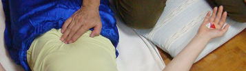 | 13. | (もし、左側に第一治療経があるなら、12と同様に、手の経3色、足の経3色をまとめて持ってもらい、比較検討して手の経か足の経かを決定する。右の上は手の3色を持ったところ、下は足の3色を持ったところ。術者の右手は操作点=心包点に置いて、反応を診る) | ![]() |