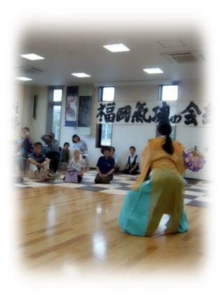 | 公演では能舞台で舞うから、一番前の席でも、舞台まで3メートルほどある。総会では、ごらんのように、手を伸ばせば袴に触れられそうになるほど間近に見ることができたのだから、ほんとにラッキーなアトラクションであった。 能のように幽玄?でもなく、神楽のように粗削り?でもなく、歌舞伎の踊りのように型苦しくもなく、派手に跳んだと思えば華麗に旋回するダイナミックな舞が洗練されている。今回は、持ち時間似合わせて、特別にあつらえた二曲。朋さんは女舞、弘さんは男舞。それぞれ10分ほどの舞。 |